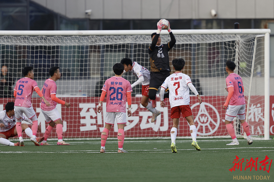12月14日下午,常德队守门员牢牢接住了进攻球。当天,2025湘超联赛1/4决赛火热上演,常德队(粉)主场对阵衡阳队。经过紧张刺激的鏖战,终场哨响,常德队1:0战胜衡阳队,率先挺进四强! 周文晋 摄(湖南图片库)