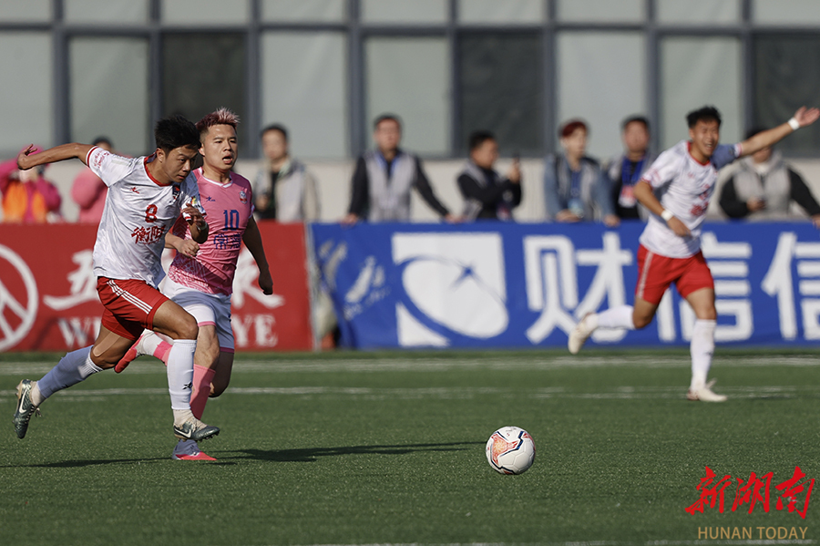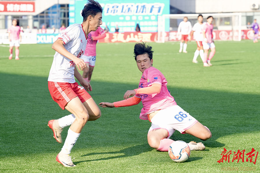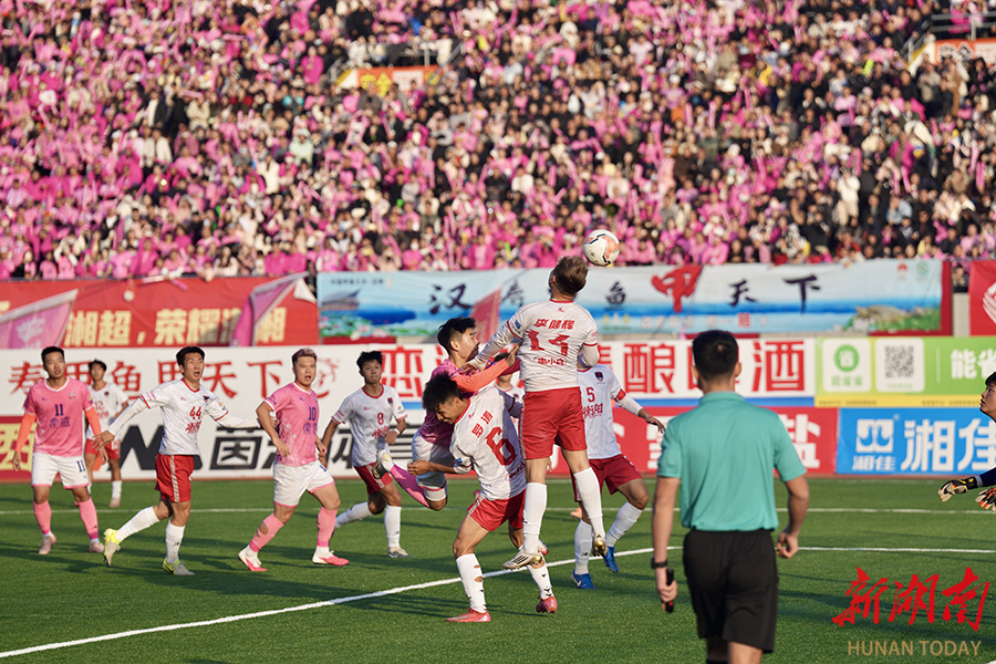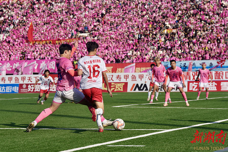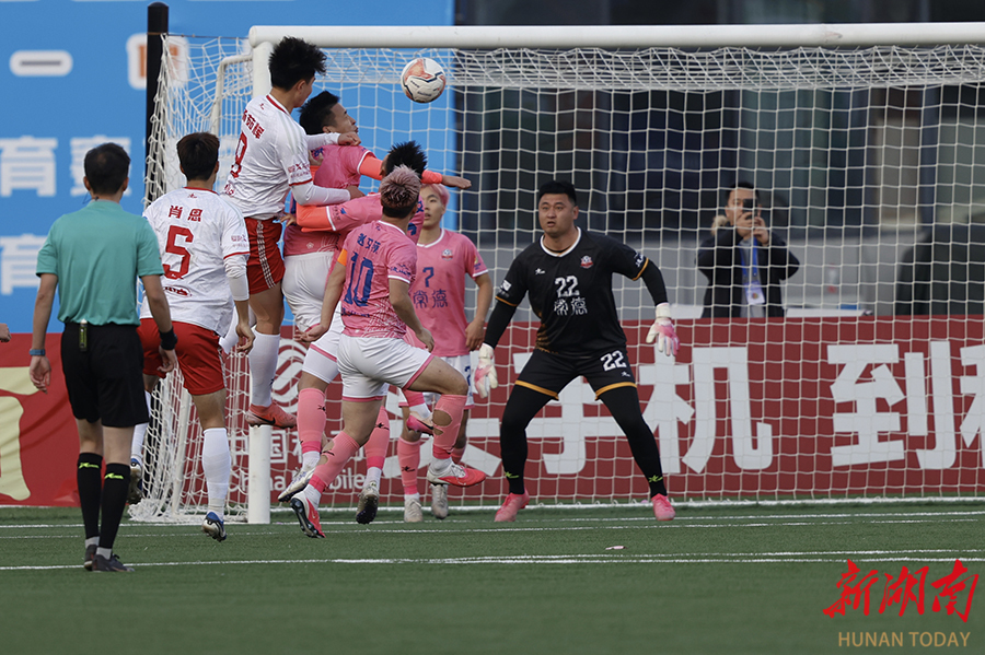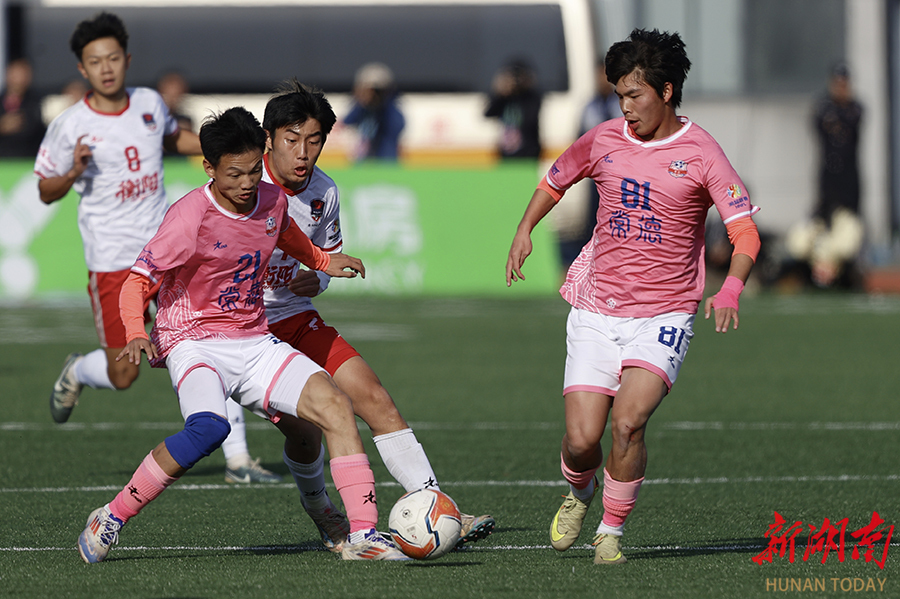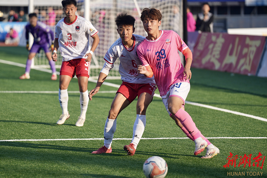 12月14日下午,双方队员在激烈比拼。当天,2025湘超联赛1/4决赛火热上演,常德队(粉)主场对阵衡阳队。经过紧张刺激的鏖战,终场哨响,常德队1:0战胜衡阳队,率先挺进四强! 周文晋 摄(湖南图片库)