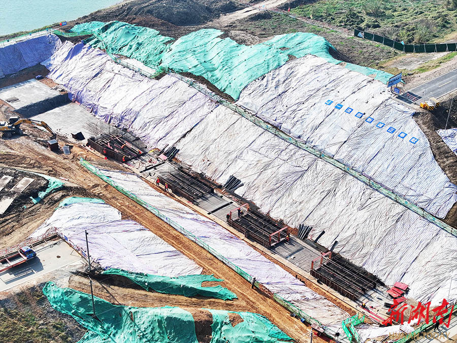 12月14日,澧县澧水澧澹街道上福社区堤段,工人在加紧穿堤涵闸改造提质项目施工。该项目为湖南省洞庭湖区重点垸堤防加固工程松澧垸大堤加固工程上福桥新电排闸拆除重建工程之一。连日来,项目部组织工人抢抓晴好天气开展穿堤涵闸改造,确保高质量完成建设任务。 柏依朴 摄(湖南图片库)