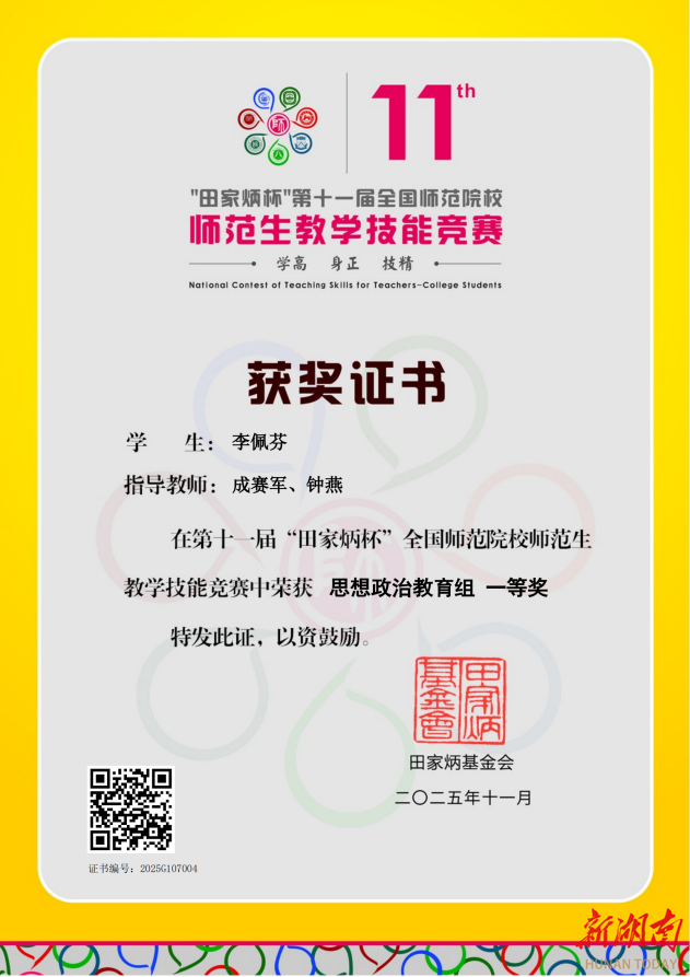 湖南日报·新湖南客户端12月15日讯(通讯员 钟燕)近日,第十一届“田家炳杯”全国师范院校师范生教学技能竞赛决赛圆满落幕。湖南人文科技学院马克思主义学院学生李佩芬凭借扎实的专业素养与出色的教学表现,在比赛中脱颖而出,荣获一等奖,彰显了学校在思政师范人才培养方面的显著成效。