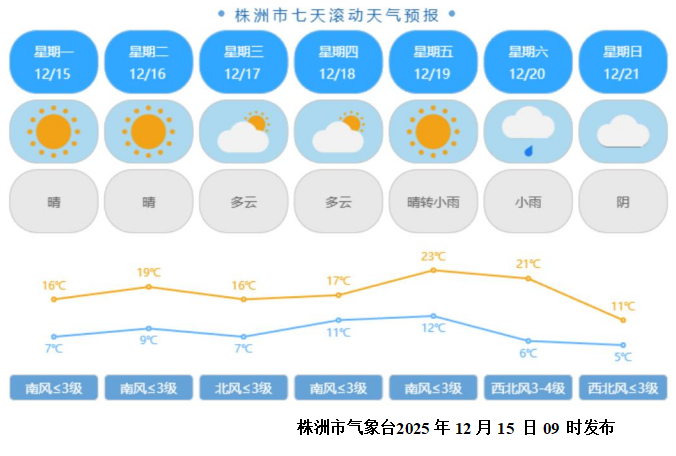 湖南日报·新湖南客户端12月15日讯(记者 龙子怡 通讯员 杨燿华)今早推开窗时,你是否觉得空气里少了些刺骨的寒意,多了几分晴暖的柔软?经历了上周末那场匆匆来去的寒潮,株洲的冬天似乎又悄悄放缓了脚步,将一段持续晴好的日子,轻轻铺展在我们面前。