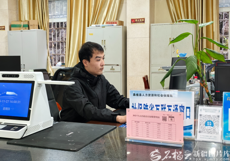11月27日,乃比江·萨拉木在桑植县人力资源和社会保障局社保服务中心服务窗口工作。石榴云/新疆日报记者 郭倩摄