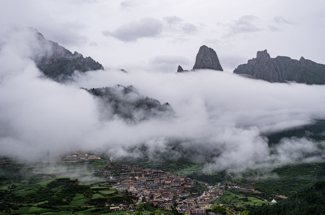 甘南扎尕那的藏寨依山而建,清晨时分,炊烟与晨雾交织,为这座石头城增添了几分神秘感。