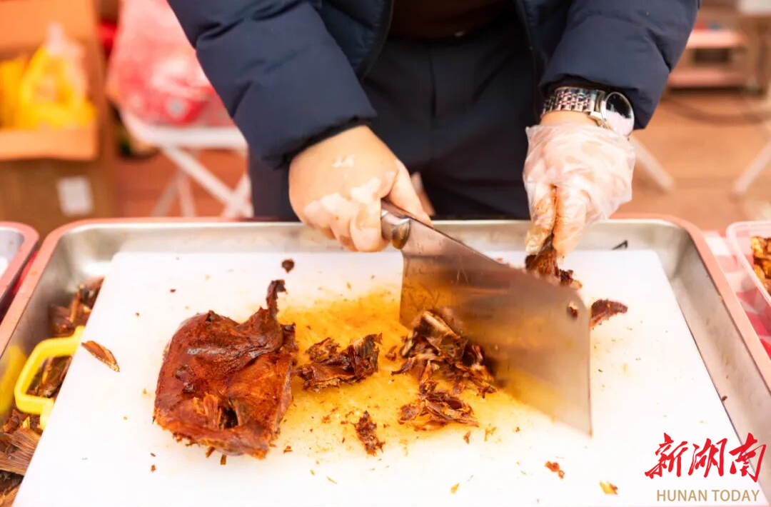 而在摊位后方,烽煌食品有限责任公司负责人、醴陵酱板鸭协会副会长曾维冬正手持刀具,片刻不停地为前方销售备货。“这两天的客流量很大,许多顾客试吃完就直接下单,生意很火爆,员工们一直在补货。”曾维冬介绍道,这次活动是醴陵酱板鸭协会主动“走出去”的关键一步,作为此次活动的协办单位,醴陵酱板鸭协会高度重视这次展示机会,将其视为推广酱板鸭品牌、走进外地市场的重要试水。