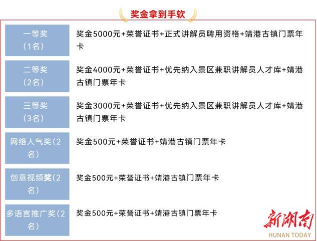 决赛前三名直接进入8天实习孵化期,表现优异者即可签约拿到靖港古镇正式讲解员offer,一个大大的舞台等着你!