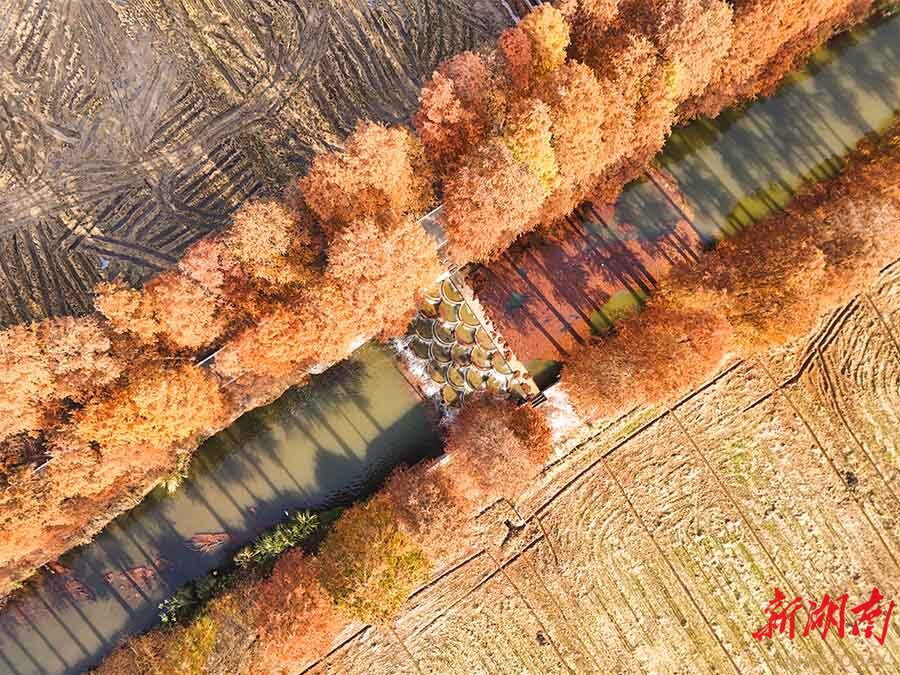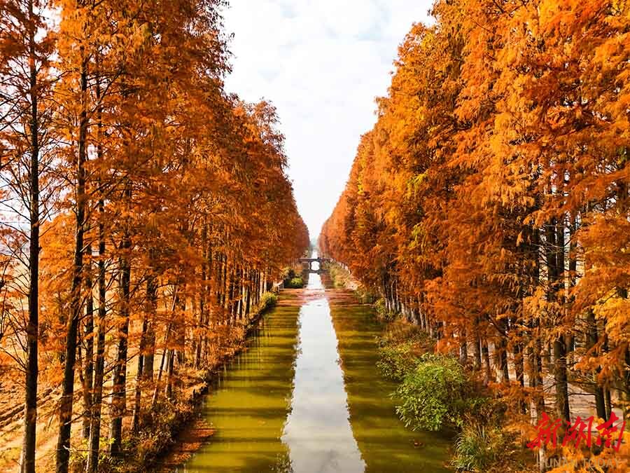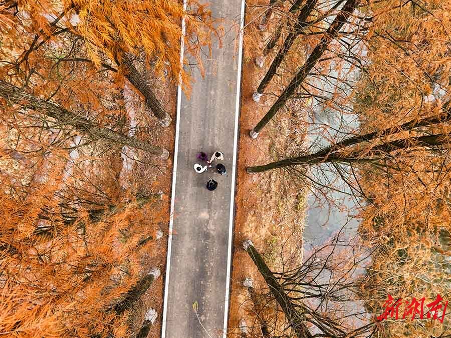 12月15日,祁东县白地市镇白地市村迎来最佳观赏期。金黄耀眼的水杉与清澈的河水相映成趣,勾勒出冬日里一道亮丽的风景线,吸引游人驻足。陈延上 摄(湖南图片库)
