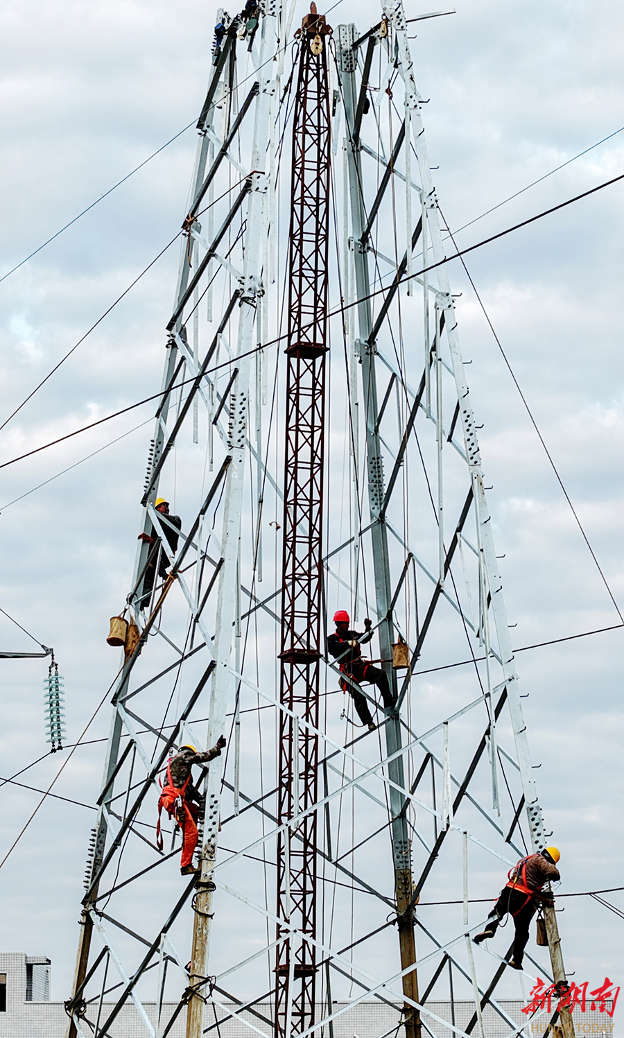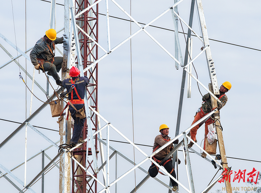 12月15日,嘉禾县龙潭镇扶塘村,电力工人在110千伏肖麦线工程进行组塔施工作业。近年来,该县电力部门积极推进电力设施升级改造工程,优化供电服务,提升用电安全,助力当地经济高质量发展。 黄春涛 摄(湖南图片库)