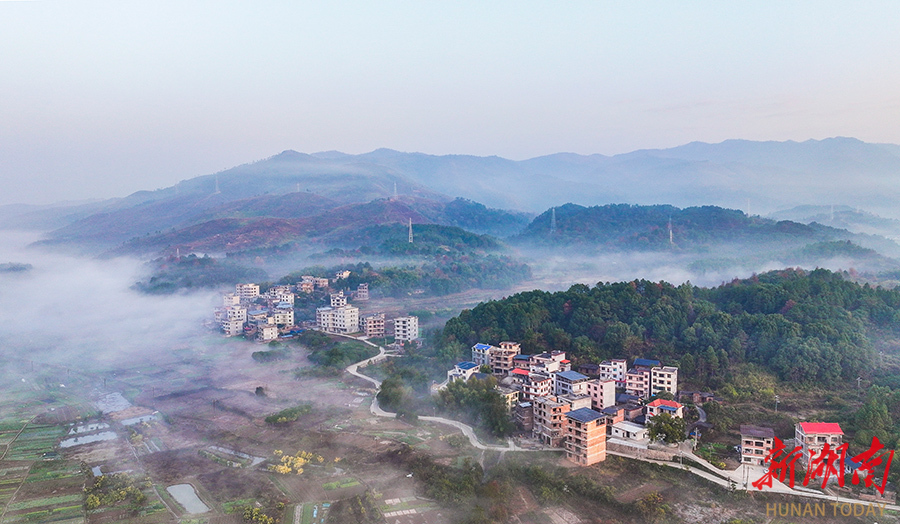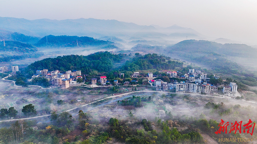 12月15日清晨,新田县龙泉街道瑶塘窝村,群山与村落在流动的云雾中若隐若现,构成一幅静谧的水墨丹青,尽显自然之美。 刘贵雄 陈祉凝 摄影报道(湖南图片库)