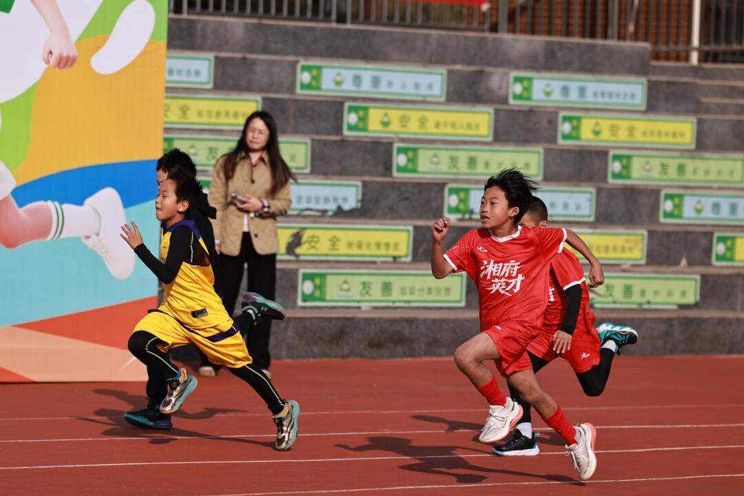 一二年级(萌趣启蒙):除了50米、200米短跑和立定跳远外,学校特别设置“一分钟智慧跳绳”和“迎面接力赛”。小选手们踮着脚尖跳绳,节奏清脆明快,哪怕绊倒也立刻起身重来;接力赛中,小小的接力棒传递着信任,让孩子们在奔跑中感受协作的力量。