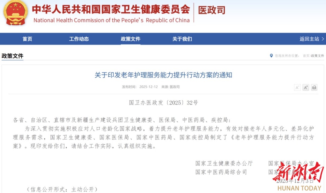 提升老年护理服务能力是深入贯彻实施积极应对人口老龄化国家战略的具体举措。截至2024年底,我国60岁及以上人口数达3.1亿,占总人口的22%,老年人特别是失能老年人对医疗护理服务呈现迫切的刚性需求。 为深入贯彻实施积极应对人口老龄化国家战略,进一步提升老年护理服务能力,有效对接老年人多元化、差异化护理服务需求,在全面梳理老年护理服务现状与发展需求、深入分析有关问题的基础上,国家卫生健康委会同有关部门研究制定了《老年护理服务能力提升行动方案》。