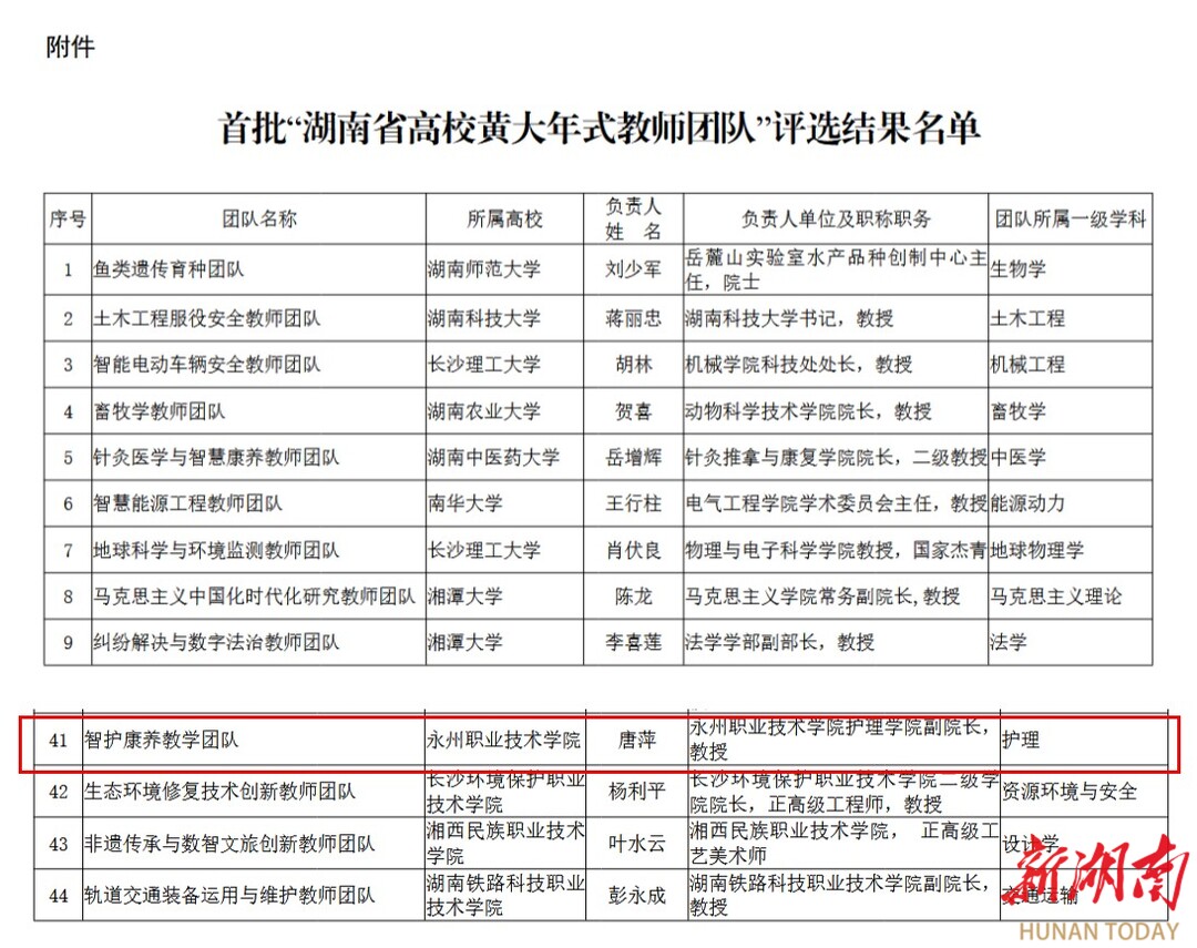 湖南日报·新湖南客户端12月16日讯(通讯员 王曙明)12月15日,湖南省教育厅公示首批“湖南省高校黄大年式教师团队”名单,永州职业技术学院护理学院智护康养教师团队成功入选,成为全省50个获此殊荣的团队之一,这是对学校职业教育师资建设与社会服务成效的重要肯定。