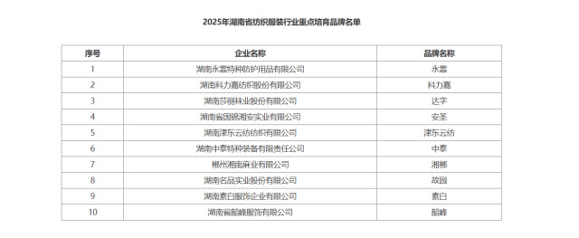 湖南日报12月16日讯(全媒体记者 谢卓芳)12月15日,省工业和信息化厅公布2025年度湖南省纺织服装行业重点培育品牌名单,“永霏”等10个品牌入选。