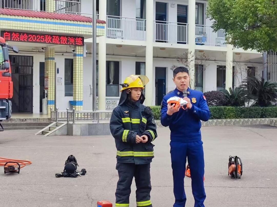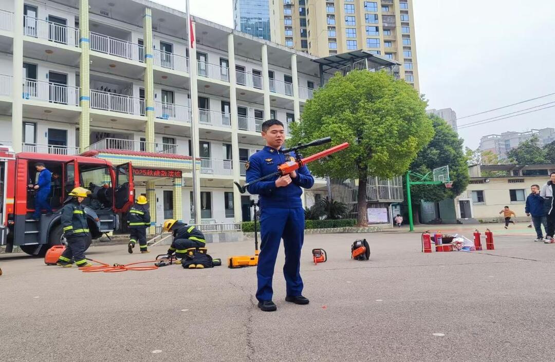 随后,消防员逐一讲解了液压破拆工具、逃生面罩等器材的功能,还现场演示了灭火器的正确使用方法——“一提、二拔、三握、四压”的操作口诀,让同学们快速掌握了灭火要领。