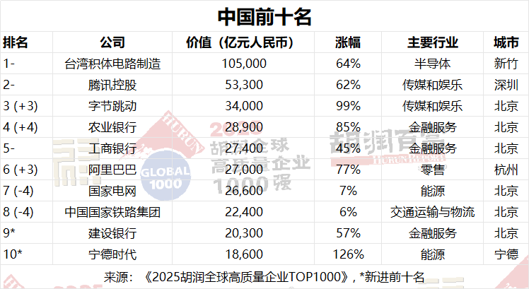 胡润集团董事长兼首席调研官胡润表示,“这份榜单凸显了人工智能、半导体和云计算重塑了全球企业价值,前十名企业中有八家扎根于先进技术。”