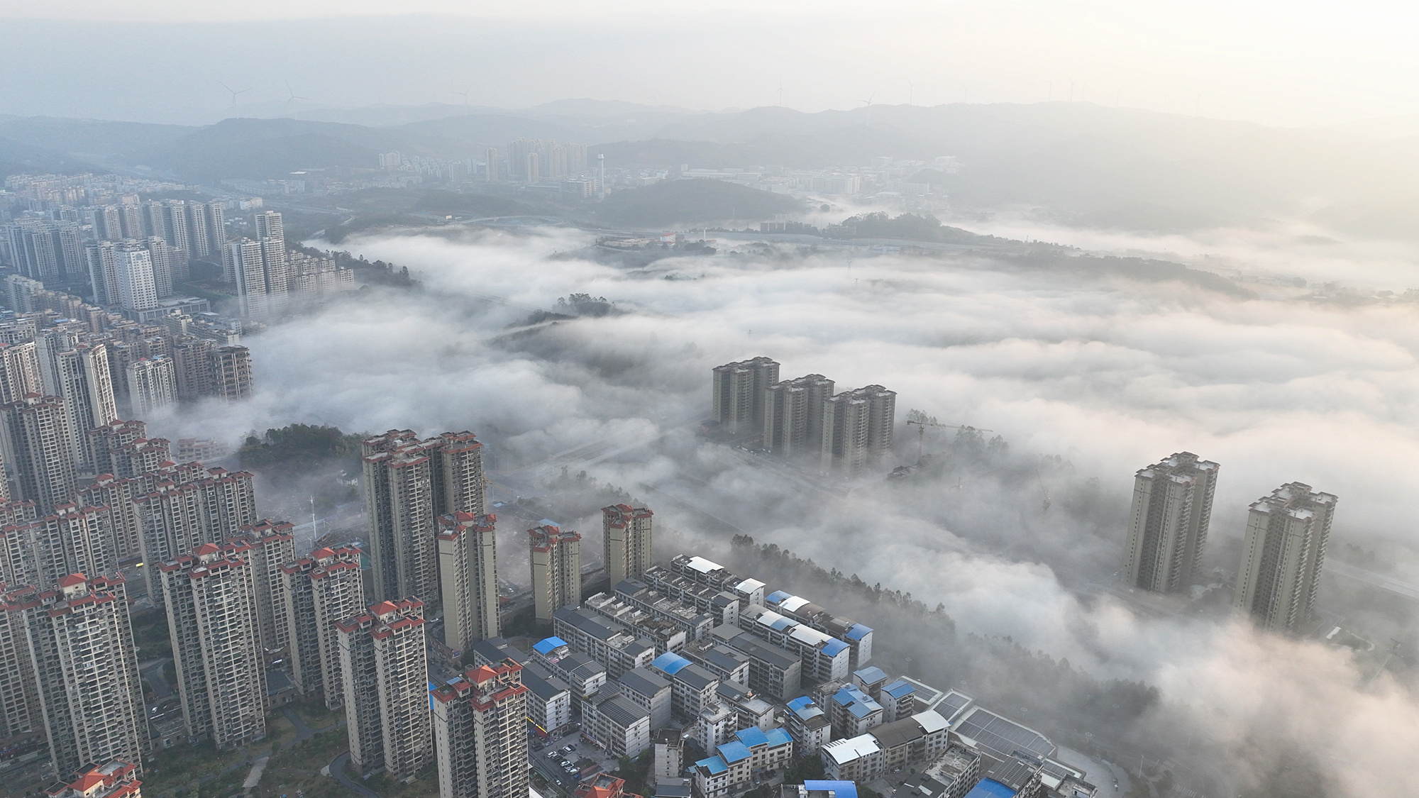 12月14日清晨,郴州市宜章县城区出现平流雾景观,薄雾如纱于楼宇间漫舞流淌,朝阳冉冉升起,金辉洒落,云雾被晕染出淡淡暖光,城市建筑在薄雾中若隐若现,宛如一幅徐徐展开的诗意画卷。