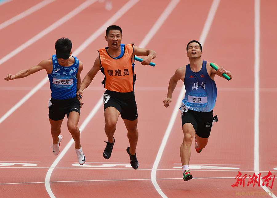 12月12日,湖南代表队运动员刘卫(右一)冲过终点。当天,在男子4x100米接力T11–13级决赛中,湖南代表队朱乾、陈世昌、孔健焜、刘卫以0.001秒的优势成绩获得冠军。