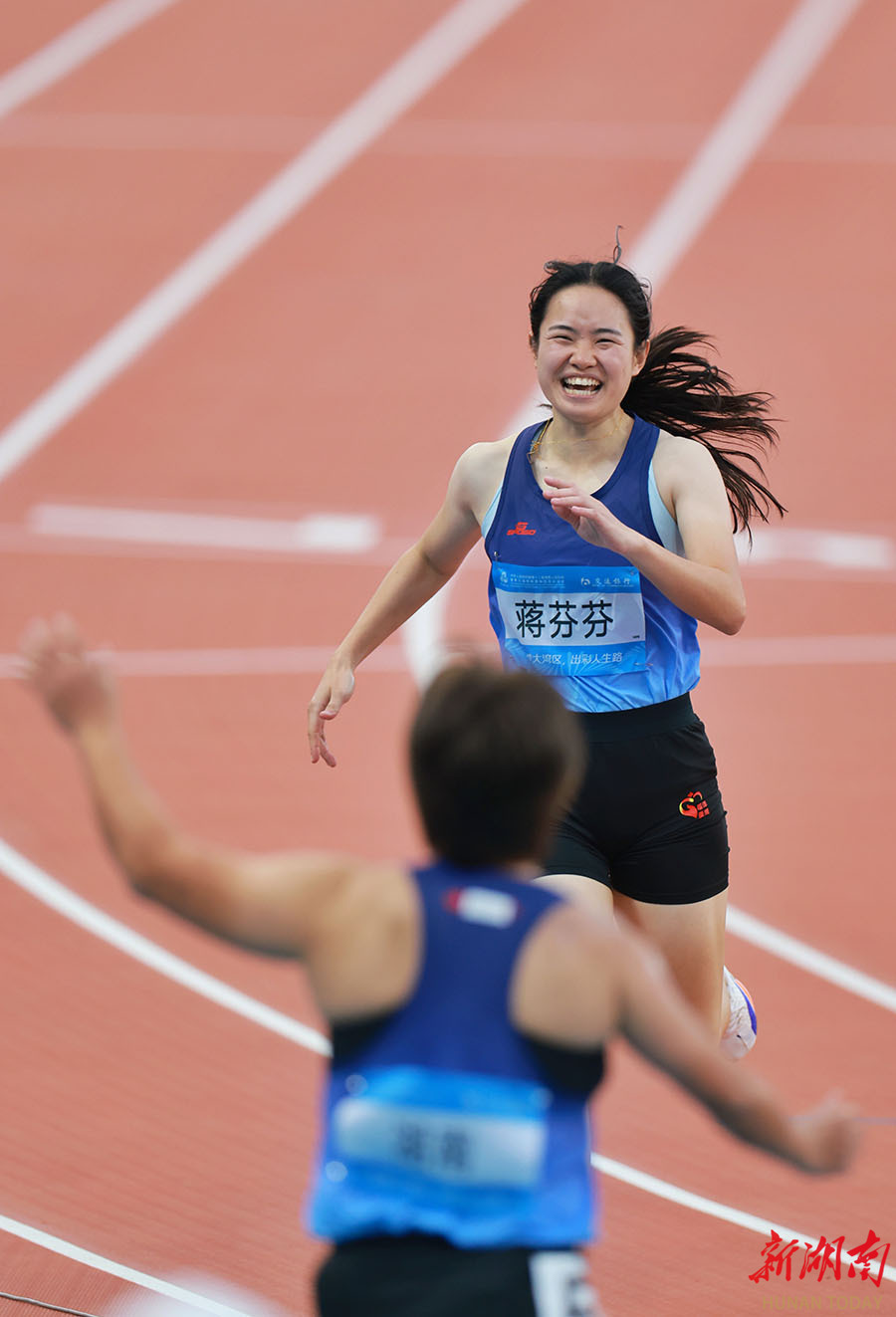 12月12日,在田径女子4×100米T35-38级比赛中,湖南代表队获得金牌。图为完赛后蒋芬芬与周霞一同庆祝。