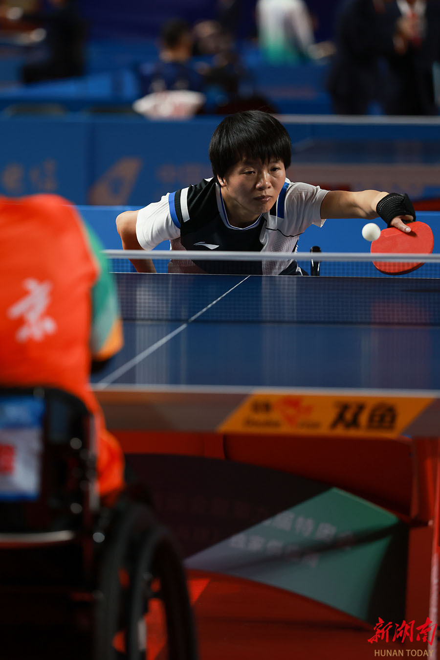 12月11日,在乒乓球TT2女子单打小组赛中,王力正在比赛。最终她在女子团体和女子双打比赛中各获得一枚铜牌。