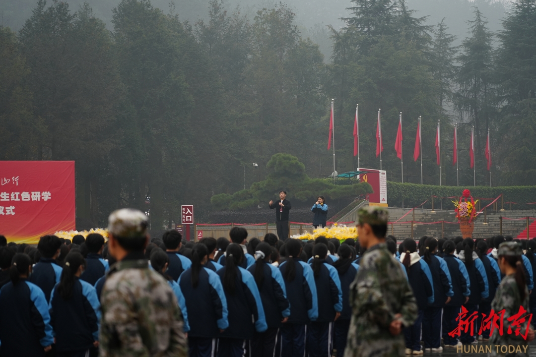 当天下午,研学团队来到韶山,在毛泽东广场举行开班仪式。同学们身着统一校服,列队肃立,激昂的《没有共产党就没有新中国》奏响,众人齐唱红歌表热爱;师生代表敬献花篮,鞠躬绕行缅怀伟人,红色信仰根植心底。
