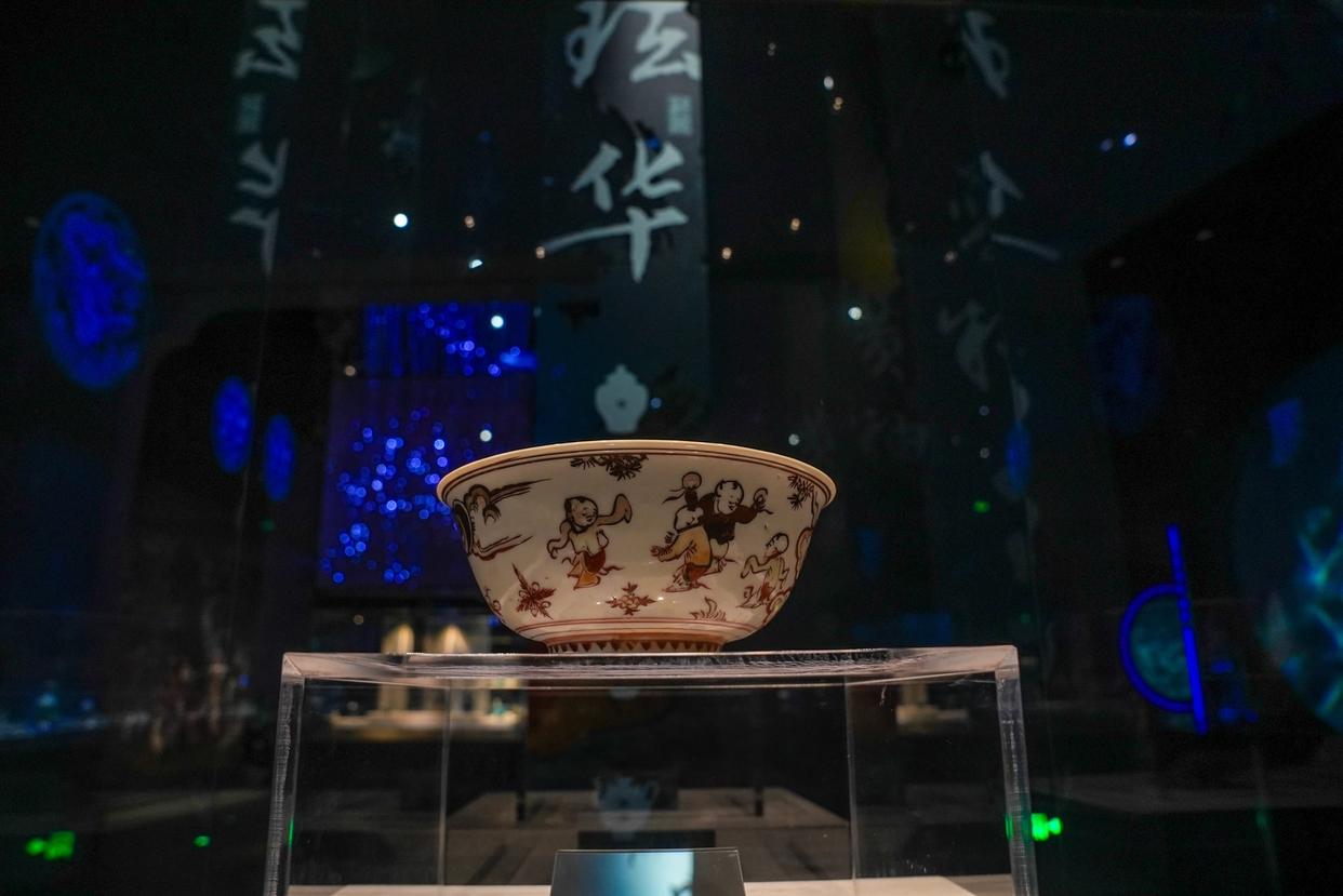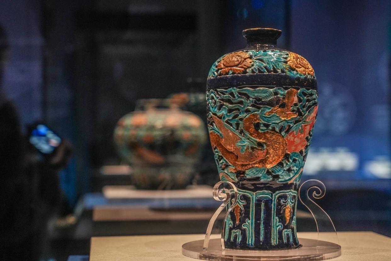 参观者沉浸感受深海发掘探测。一批珐华彩瓷器被放在展厅最显眼的位置。一水儿的蓝釉、孔雀绿绘满瓶身,但各有各的特色——或镂空、或贴金、或雕画,还有古代匠人精心勾勒的层层浪花纹、应龙纹、牡丹纹……依然保持着约500年前的模样。