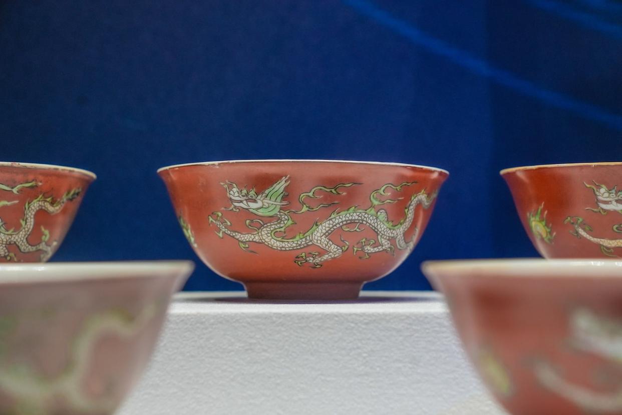 矾红彩描金龙纹碗。在郑睿瑜眼里,每一件展品都有故事,值得细品。即便是展厅的布置,也充满“海味”,大量的镜面营造出波光粼粼的效果,地面也装饰着“沉船遗迹”。