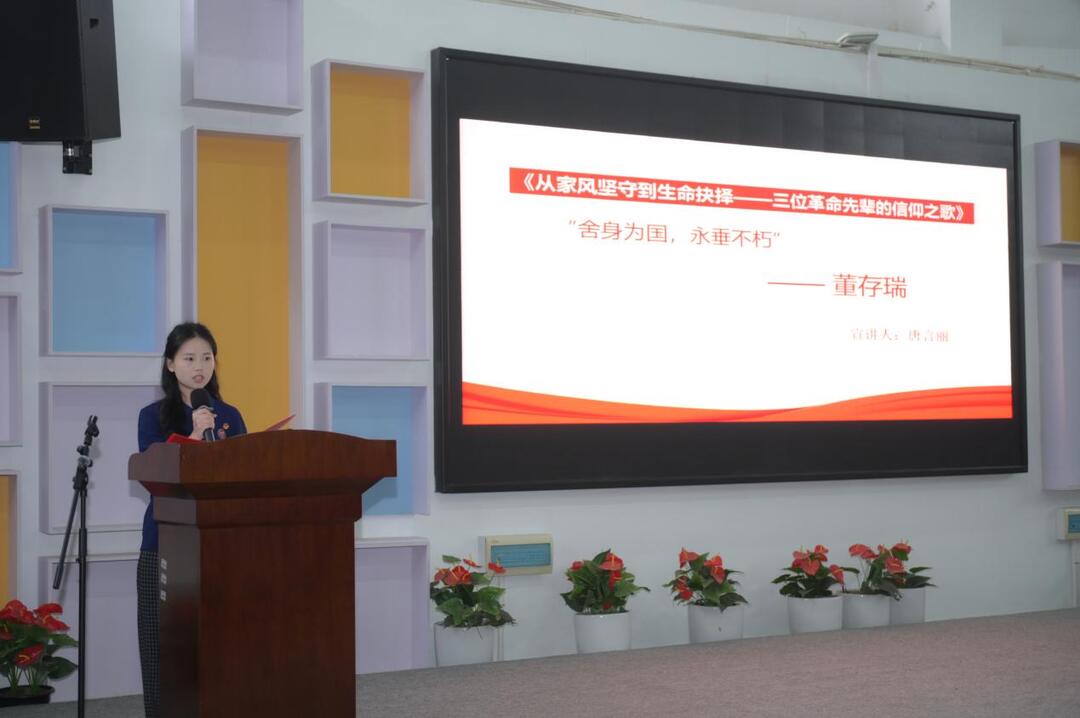 宣讲中,全国高校大学生讲思政课公开课展示活动特等奖获得者戴童萱与青马协会学生组成第一组团队,以“从家风坚守到生命抉择”为主题,生动讲述了罗荣桓、江竹筠、董存瑞三位革命先辈的事迹,展现了共产党人廉洁坚贞、勇于牺牲的精神风貌。