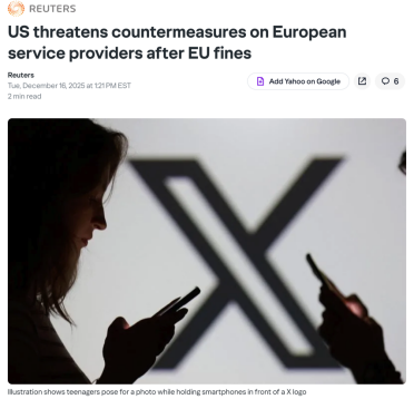 但美国的反击并没有把焦点局限在“X被罚是否合理”,而是延伸到了更大叙事范围中。美国贸易代表办公室把欧盟的罚款、诉讼、监管与部分国家的数字服务税(DST)打包为一套“针对美国服务提供商的系统性歧视”,并把报复的可能性从商品关税扩展到可能对欧洲企业收费、甚至卡一部分欧洲企业的业务上。