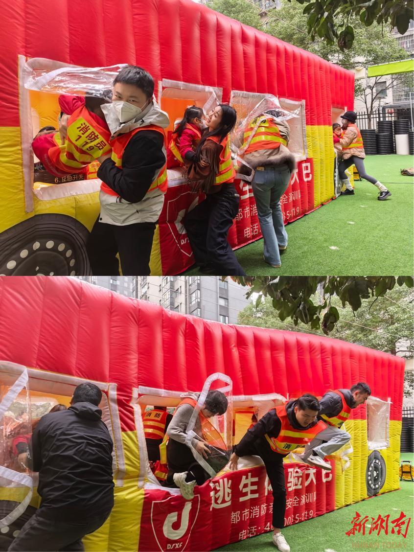 为增强实战感,活动设置了丰富的互动体验环节。在灭火器实操区,家长和孩子们在教官指导下学习使用干粉灭火器扑灭模拟火源;更引人注目的是亲子大巴车逃生、云梯救援体验、车轮滚滚协作等情景模拟项目,家庭成员在互动协作中不仅提升了安全技能,也增强了彼此间的默契与信任。