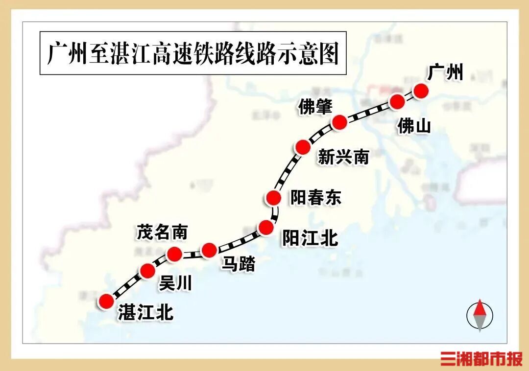 广湛高铁自广州站引出,向西经广东省佛山市、肇庆市、云浮市、阳江市、茂名市、湛江市,终至湛江北站,全长401公里,设计时速350公里,是连接粤港澳大湾区和海南自由贸易港、北部湾城市群高速铁路大通道的重要组成部分。