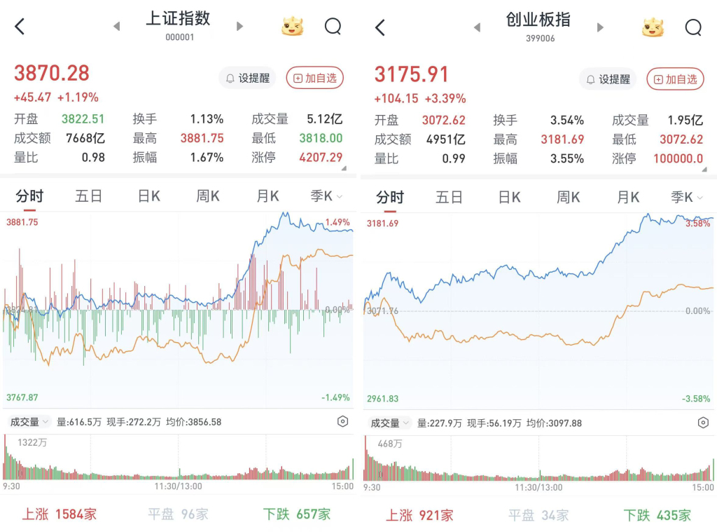 至收盘,上证综指涨1.19%,报3870.28点;科创50指数涨2.47%,报1325.33点;深证成指涨2.4%,报13224.51点;创业板指涨3.39%,报3175.91点。