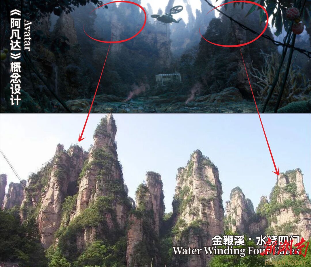《阿凡达》取景地之八——水绕四门:金鞭溪、鸳鸯溪、龙尾溪、索溪四条溪流的交汇之地。这里山回水转,奇峰簇拥,茂林修竹掩映着一方清幽盆地,势阔气爽,通达幽深。它是《阿凡达》概念设计原型!其山环水绕的隐秘环境,完美复刻了潘多拉森林深处的栖息地风貌,成为电影中秘境场景的现实蓝本。