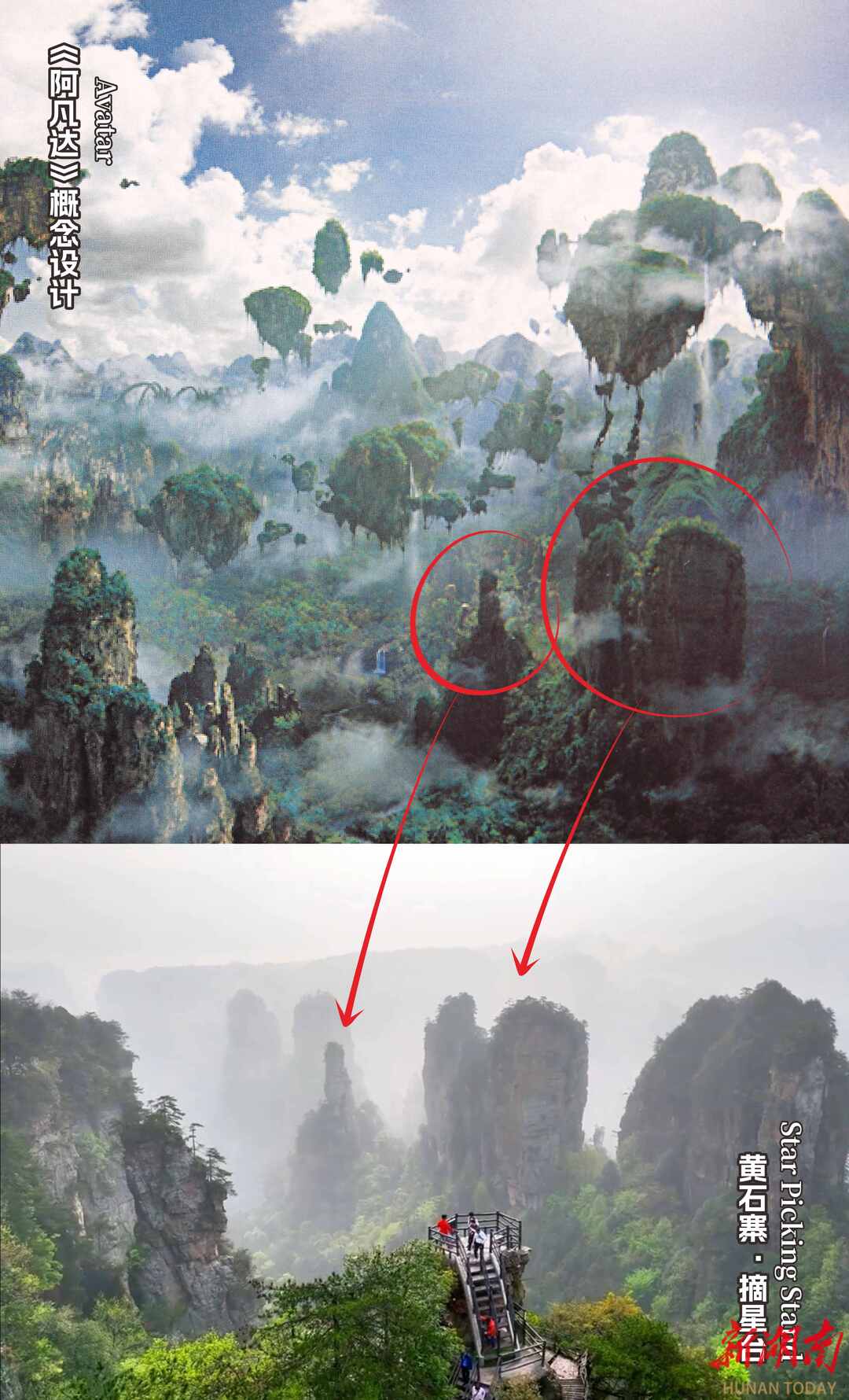 《阿凡达》取景地之五——摘星台:黄石寨最高的凌空观景台,打卡张家界地貌方山平台地貌的绝佳之地。三面悬崖环抱,仅一方石径蜿蜒相连,由山梁尽头的两块砂岩相叠构成,远山近景一览无余,皓月当空时,仿佛伸手就能触到潘多拉的星辰。它是《阿凡达》概念设计原型!其孤峰形态、植被覆盖的细节,被搬进了潘多拉星球的最初设设想之中,让电影里的奇幻世界有了 “现实骨架”。