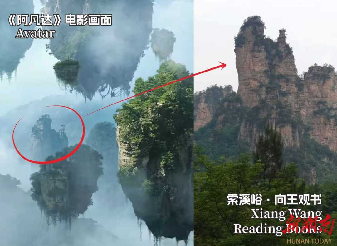 《阿凡达》取景地之十——向王观书:坐落于十里画廊之中,一座巨大的石峰形似端坐的人形,双手捧书,仿佛正津津有味地品读着亿万年的地质传奇,形态惟妙惟肖。它是《阿凡达》电影的实景参照!其独特的拟人化峰形,为海报中奇幻地貌的人文感设计提供了灵感,让潘多拉星球更具故事性。