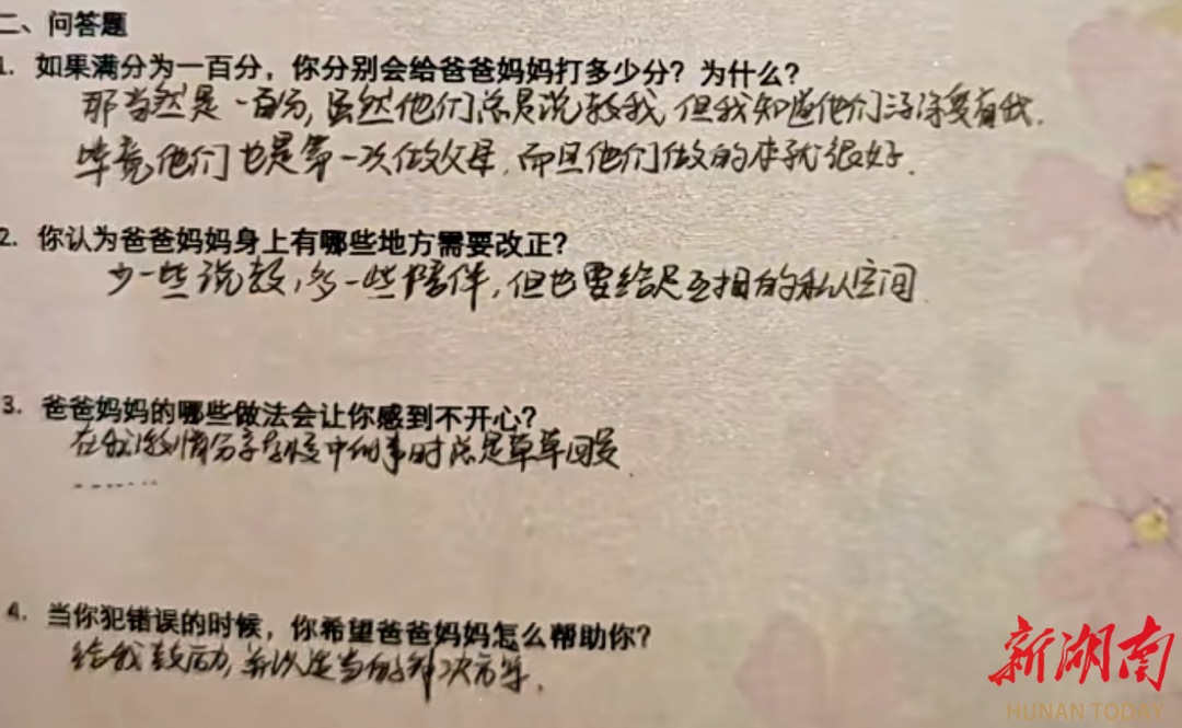 宁乡市金海中学直接上了“真心话问卷”,开启灵魂拷问:“给爸妈打多少分?”“想让他们改啥?”“啥做法让你不开心?”