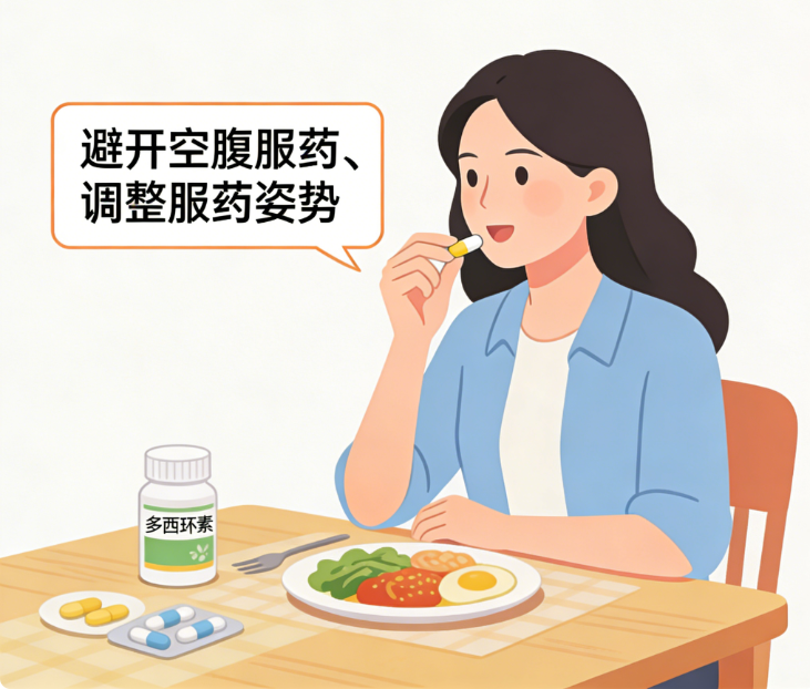 1. 足量饮水送服:服用多西环素等有一定刺激性的药物时,需用200~300毫升温水送服,避免用少量水或干吞,防止药物黏附于食管壁。服药后不要立即躺下,建议站立或端坐30分钟以上,借助重力让药物顺利进入胃部,减少在食管停留的时间。