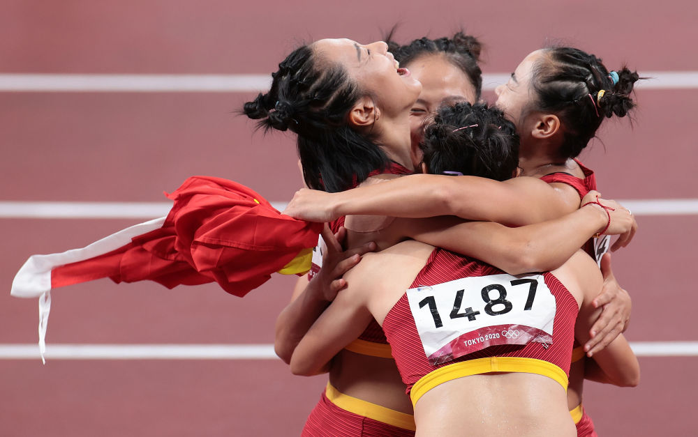 2021年8月6日,中国女子接力队在比赛后拥抱庆祝。新华社记者 李钢 摄