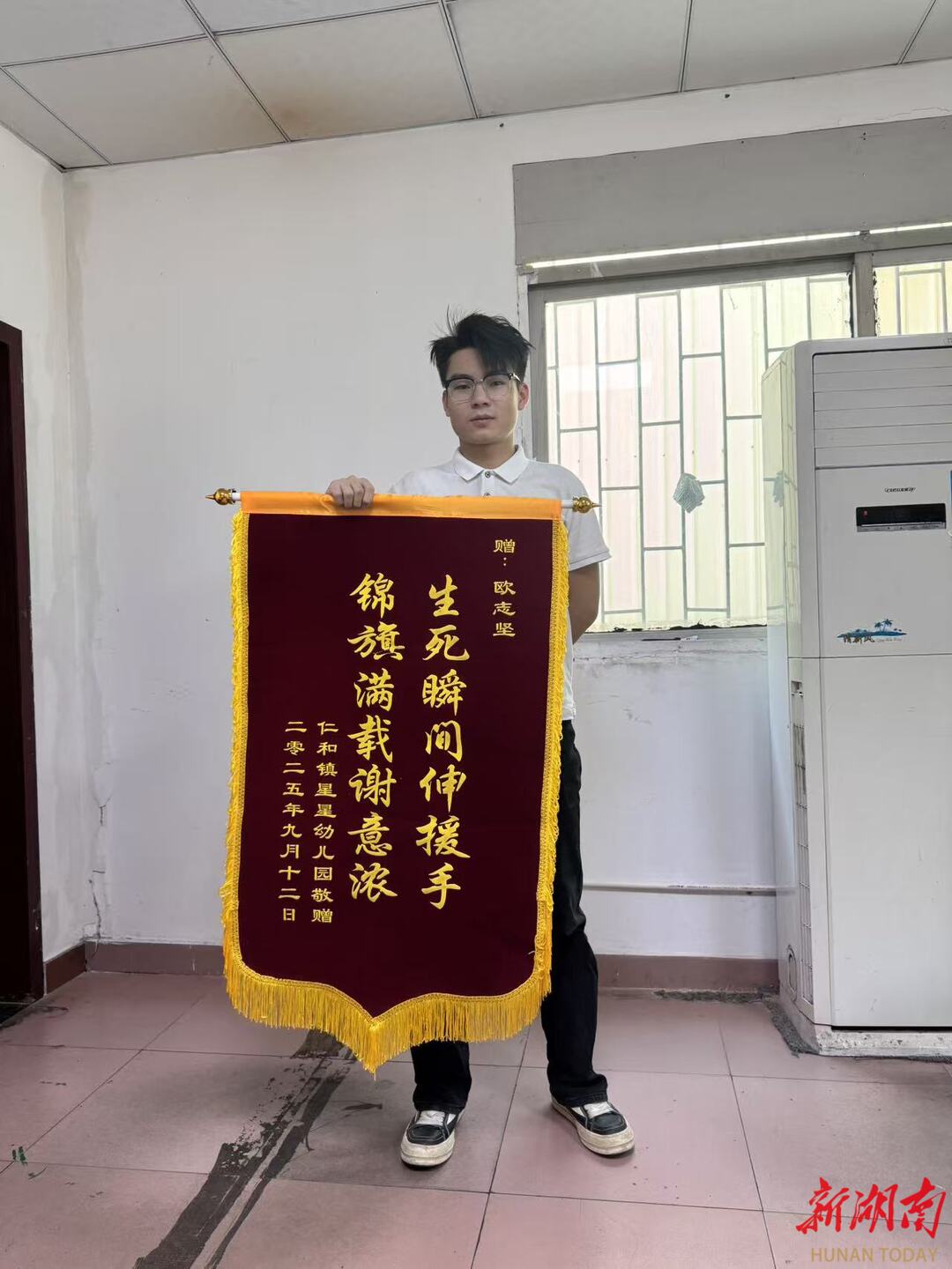 湖南日报12月17日讯(全媒体记者 蒋诗雨 通讯员 张华一 张晨莲)“孩子快不行了,求求好心人,停一停,捎一捎孩子……”近日,永州市宁远县仁和镇星星幼儿园一名幼儿突发疾病,情况危急。幼儿园教师抱着孩子冲到路边拦车时,湖南工业职业技术学院汽车工程学院学生欧志坚路过并果断停车,一路疾驰,仅用12分钟将孩子送至医院,为抢救赢得宝贵时间。今日,获救幼儿的老师经多方寻找,将一面锦旗送至正在实习的欧志坚手中。