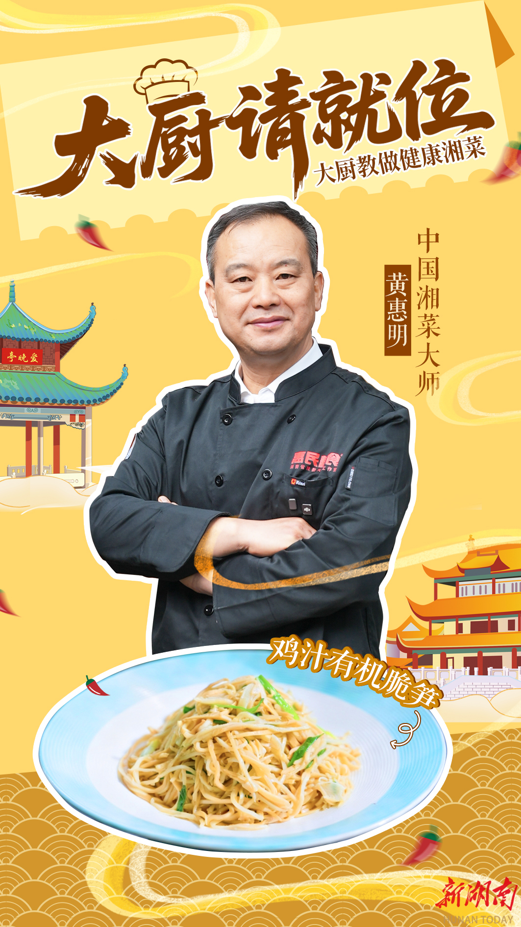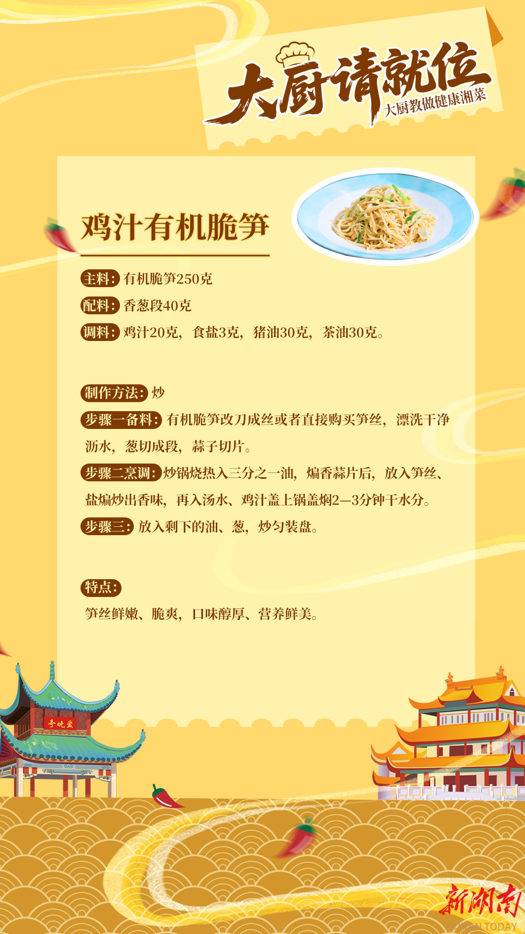 想知道让笋脆鲜爽不油腻的秘诀?本期《大厨请就位》栏目邀请湘菜大师黄惠明,带来一道“清鲜本味”的健康湘菜——鸡汁有机脆笋。大师严选有机脆笋,脆嫩无渣、自带甘甜,好食材简单做。
