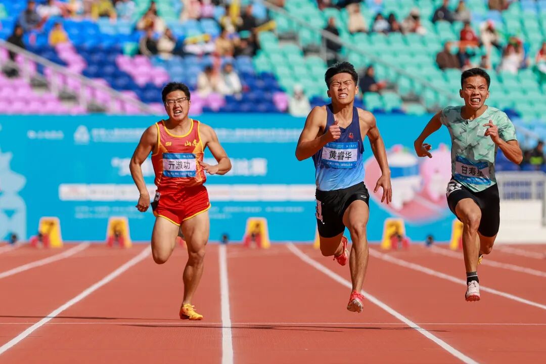 12月14日,黄睿华(中)在田径男子100米T44级比赛中奋勇争先,最终获得银牌。