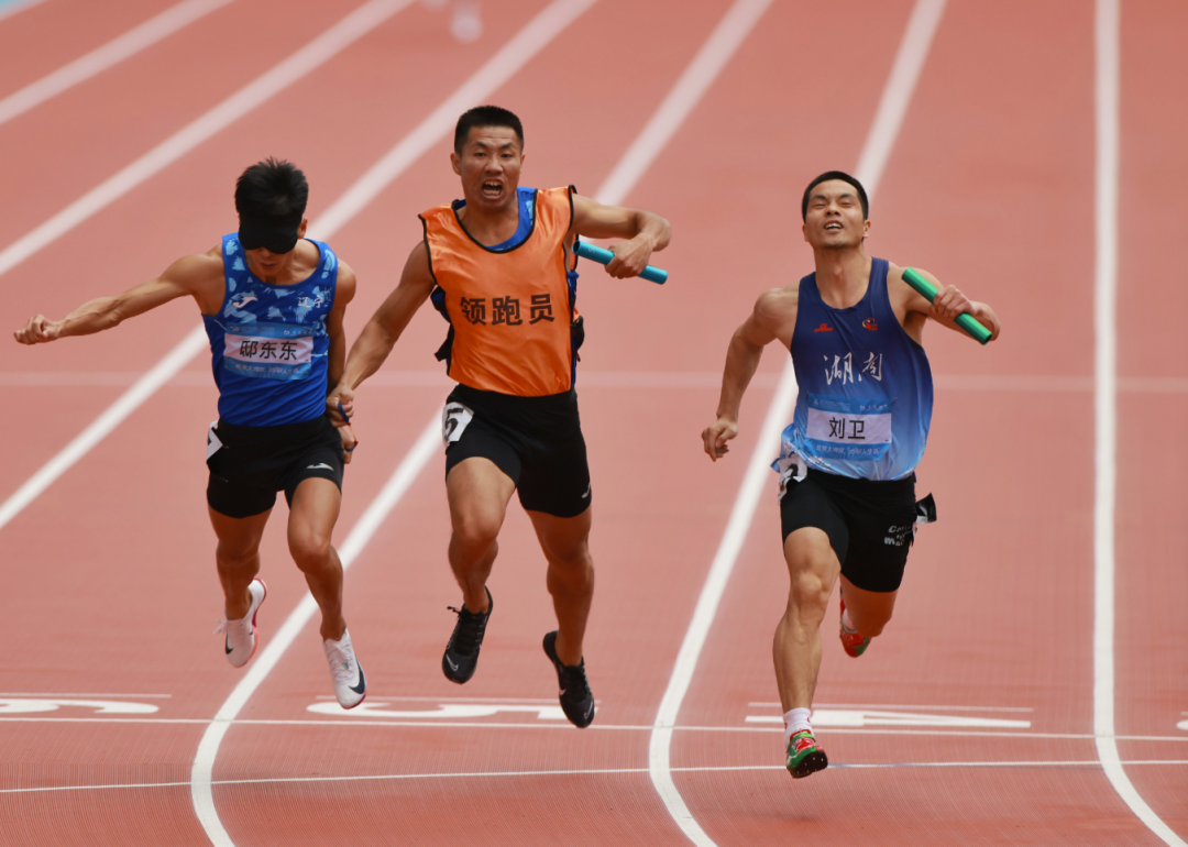 12月12日,湖南代表队运动员刘卫(右一)冲过终点。当天,在男子4x100米接力T11–T13级决赛中,湖南代表队朱乾、陈世昌、孔健焜、刘卫以0.001秒的优势获得冠军。