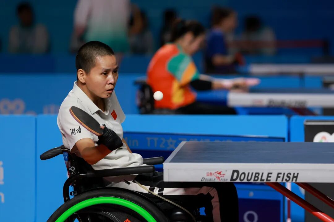 12月11日,在乒乓球TT2女子单打小组赛中,王力正在进行比赛。最终她在女子团体和女子双打比赛中各获得一枚铜牌。