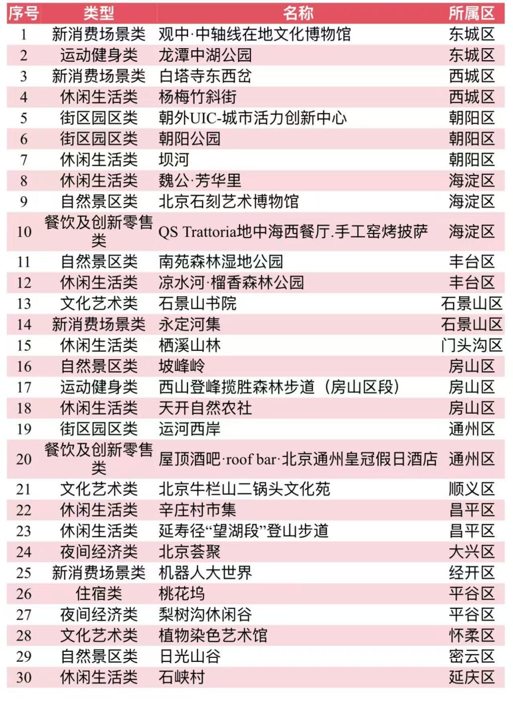 作为城市活力中心,朝外UIC-城市活力创新中心、朝阳公园、运河西岸等地标,共同组成了街区园区类打卡地。南苑森林湿地公园、坡峰岭、北京石刻艺术博物馆和日光山谷,为人们提供了亲近自然的去处,归入自然景区类打卡地。龙潭中湖公园、西山登峰揽胜森林步道(房山区段)和延寿径“望湖段”登山步道属于运动健身类打卡地。提供特色消费的QS Trattoria地中海西餐厅.手工窑烤披萨和屋顶酒吧·roof bar·北京通州皇冠假日酒店则属于餐饮及创新零售类打卡地。点亮夜晚的北京荟聚和梨树沟休闲谷是夜间经济类打卡地的代表;提供特色住宿的桃花坞则构成了住宿类打卡地。这30处打卡地为市民游客提供了丰富、立体的休闲选择。