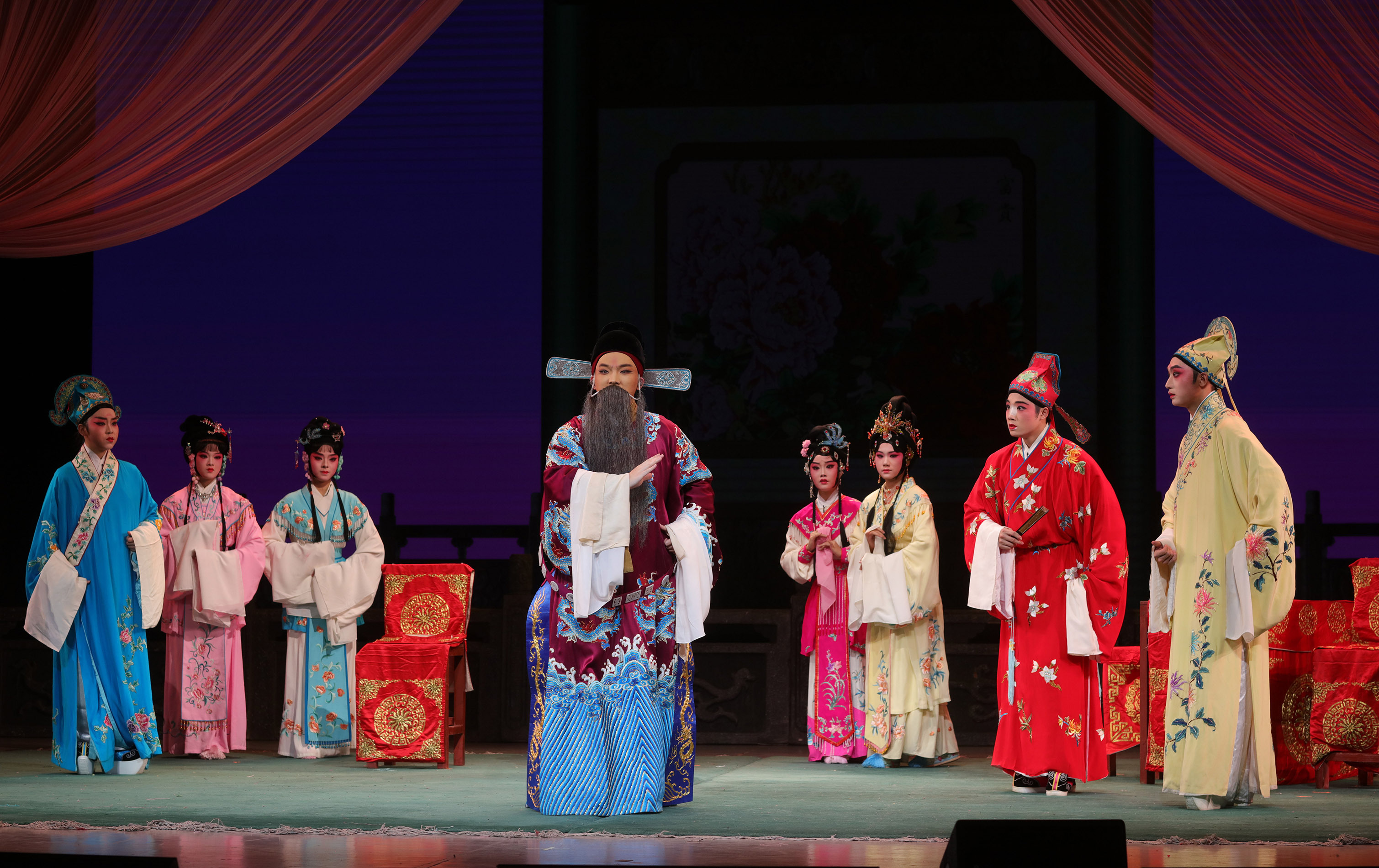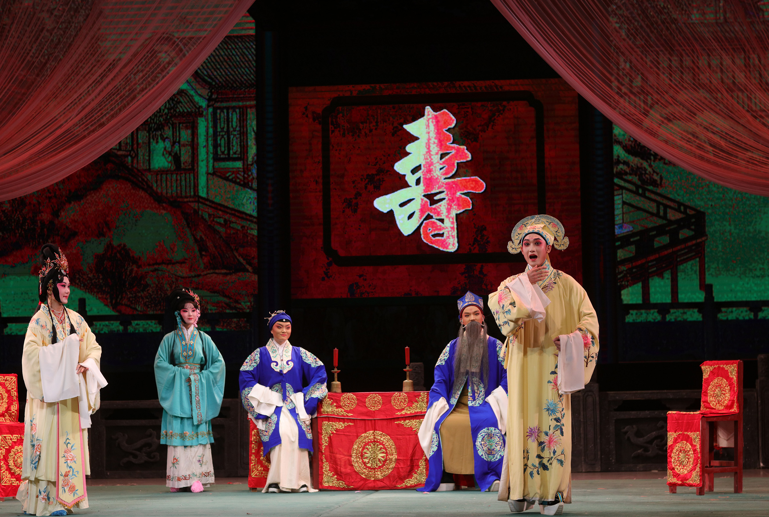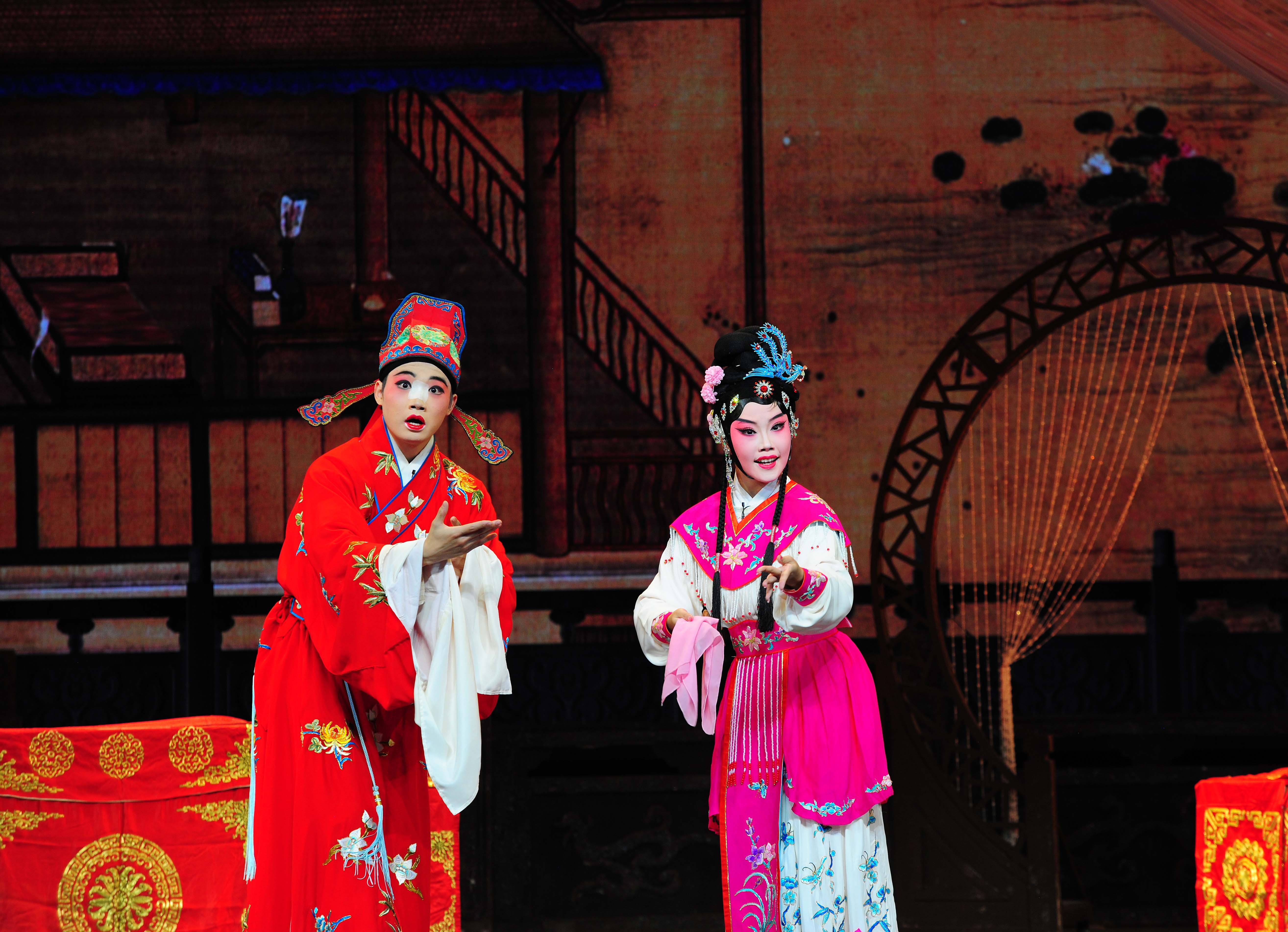 12月15日,湖南艺术职业学院星河剧场,资兴花鼓班学子在表演《五女拜寿》。 当日,由资兴委托湖南艺术职业学院定向培养的五年制花鼓戏大专班举行毕业展演。这群平均年龄不到20岁的青年演员,怀揣对传统戏曲的赤诚与热爱,历经五个春秋的唱念做打、手眼身法系统训练,从生涩到终将在舞台上交出属于他们的青春答卷,为资兴戏曲的保护传承注入了新鲜血液,让非遗代代传承。