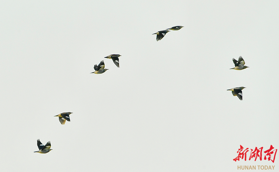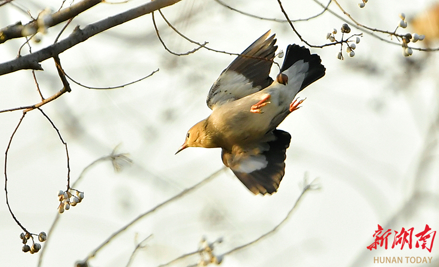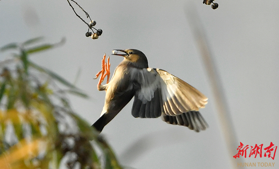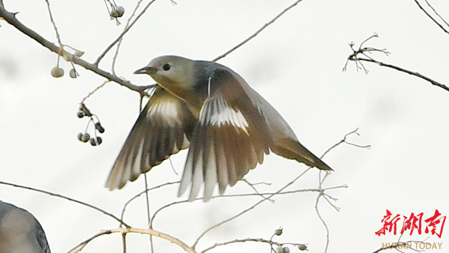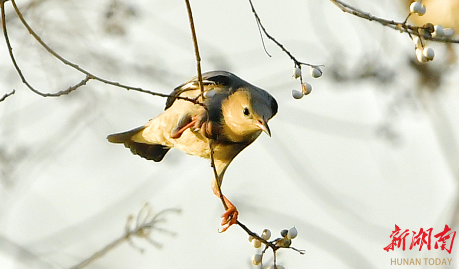 12月17日,丝光椋鸟在长沙洋湖国家湿地公园枝头自由觅食。丝光椋鸟隶属于雀形目椋鸟科,雄鸟具有独特的白头红嘴特征,雌鸟和亚成鸟头部呈灰色,常成小群栖息于开阔地带,以昆虫和果实为食。 湖南日报全媒体记者 徐行 摄