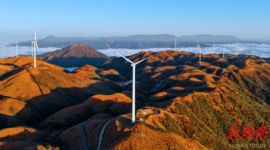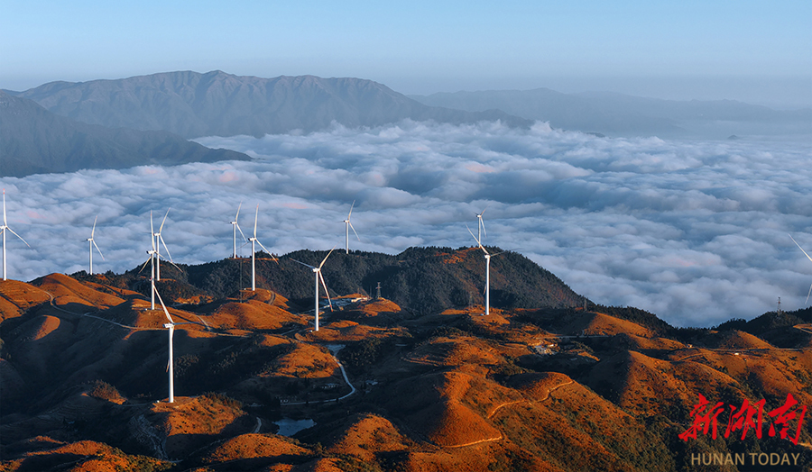 12月17日清晨,桂东县万洋山,旭日映照下,风力发电机与云海、蓝天相映成趣,构成自然与现代交融的冬日晨景。 邓仁湘 摄(湖南图片库)