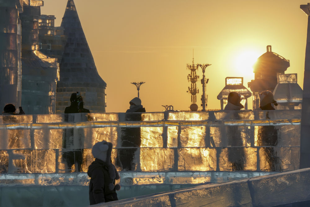 ↑ 12月17日,游客在哈尔滨冰雪大世界园区内参观游览。新华社记者 王松 摄