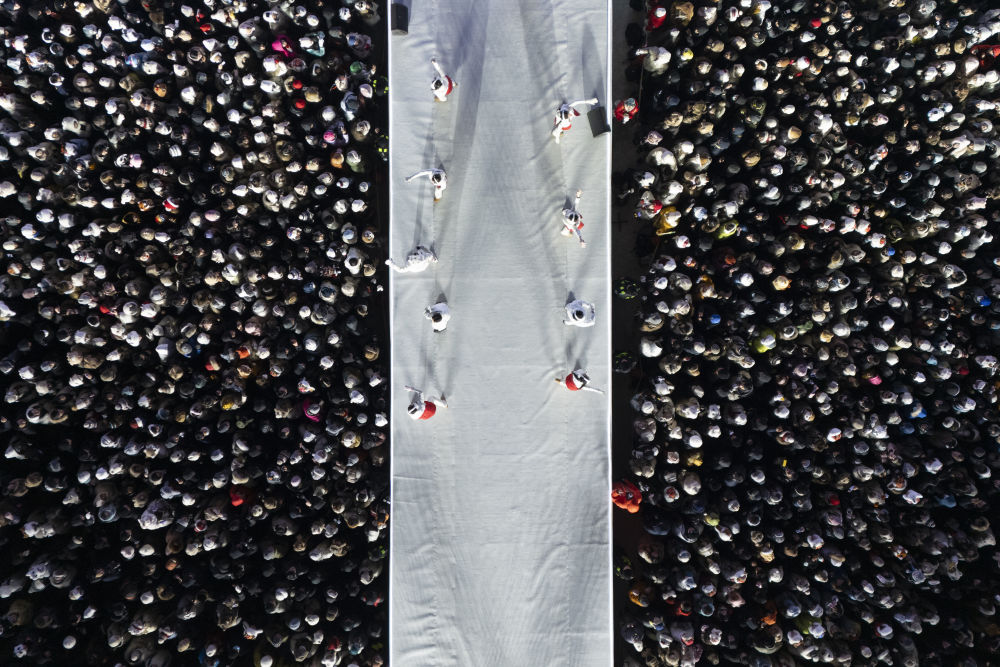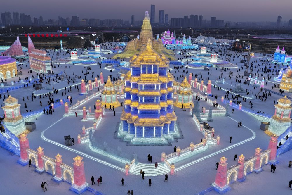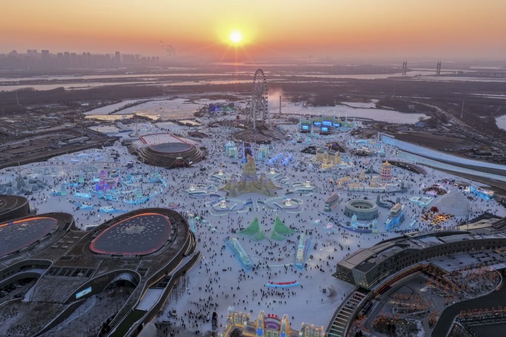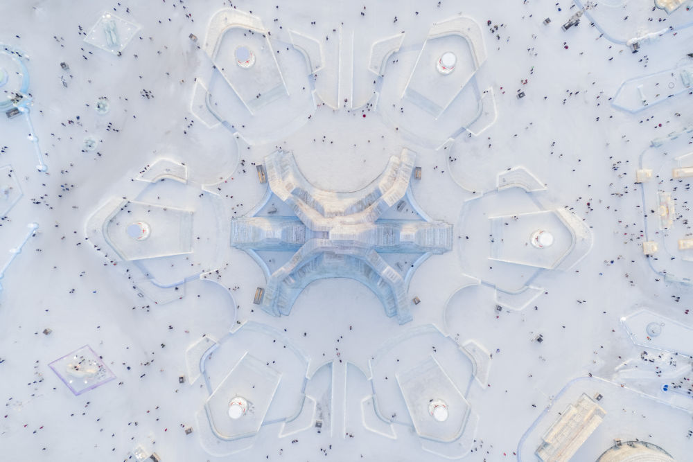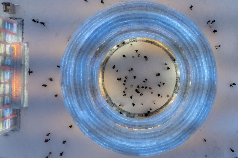 ↑ 12月17日,游客在哈尔滨冰雪大世界园区游玩(无人机照片)。新华社记者 张涛 摄