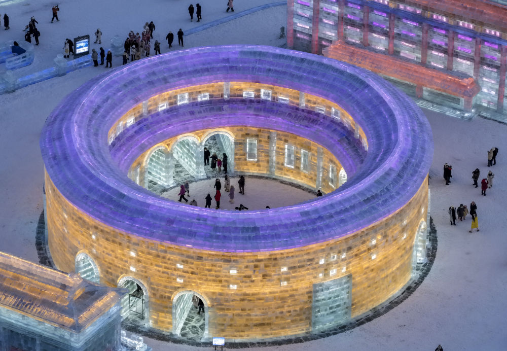 ↑ 这是12月17日拍摄的哈尔滨冰雪大世界园区内的冰建景观(无人机照片)。新华社记者 王松 摄