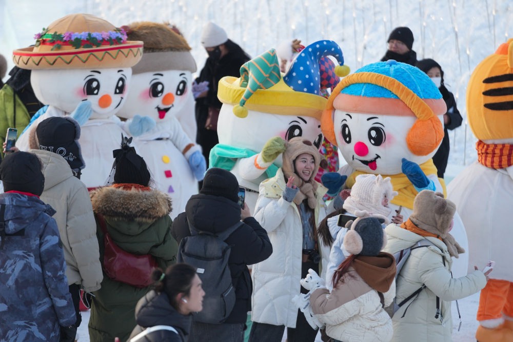 ↑ 12月17日,在哈尔滨冰雪大世界园区内,游客与巡游队伍中的卡通形象合影。新华社记者 王建威 摄