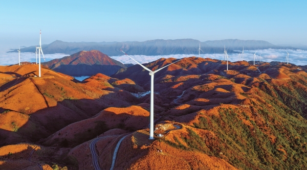 12月17日清晨,桂东县万洋山,旭日映照下,风力发电机与云海、蓝天相映成趣,构成自然与现代交融的冬日晨景。邓仁湘 摄(湖南图片库)